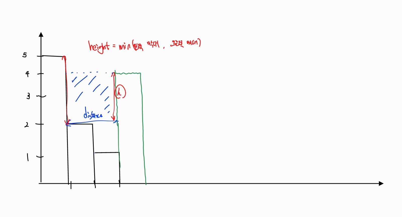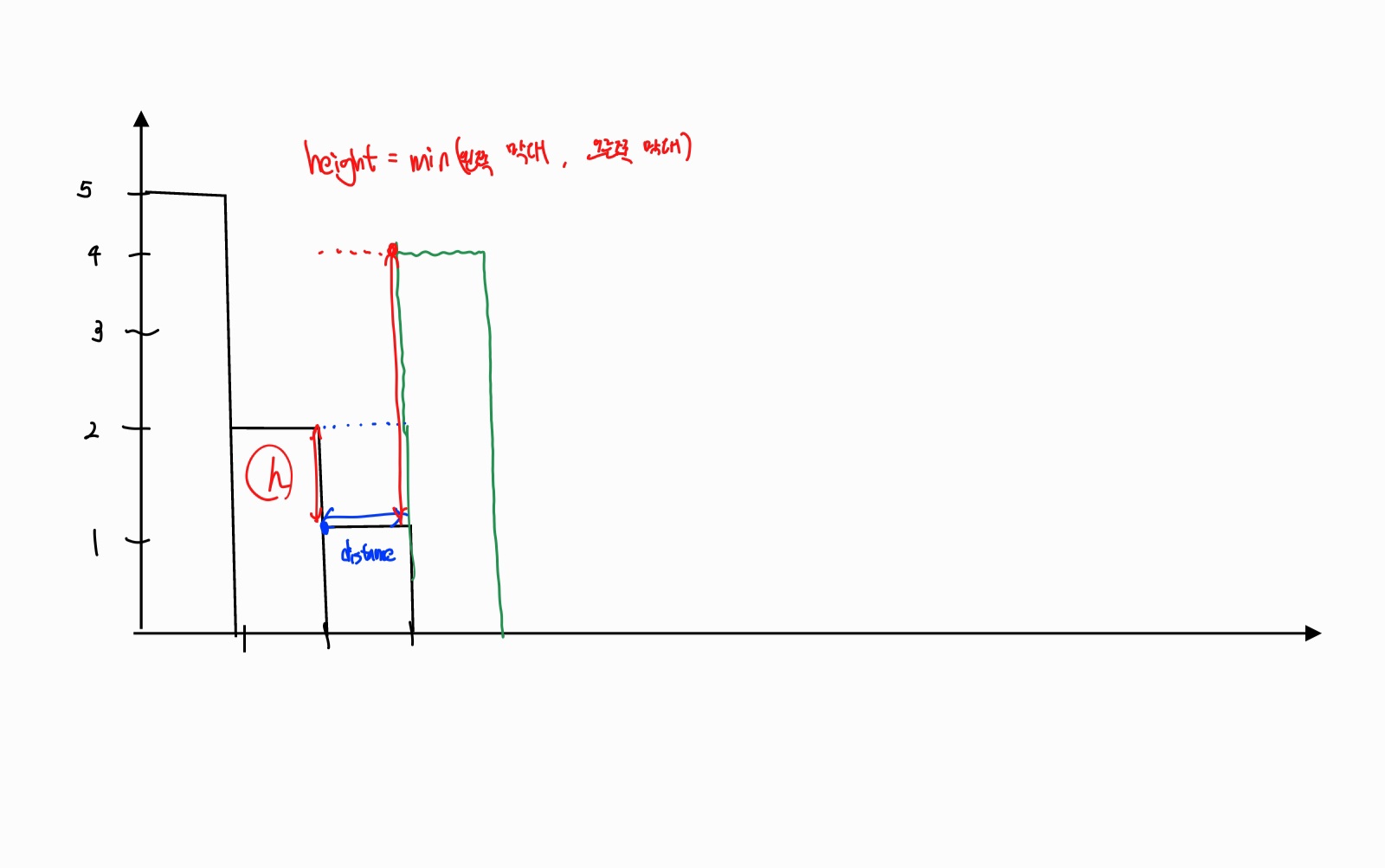 이 때 채울 수 있는 물의 양은 막대 하나와 새 막대의 거리 * min(왼쪽 막대, 오른쪽 막대) 높이 차 로 각 막대와 새 막대의 차이 때문에 담을 수 있는 물의 양을 구합니다.