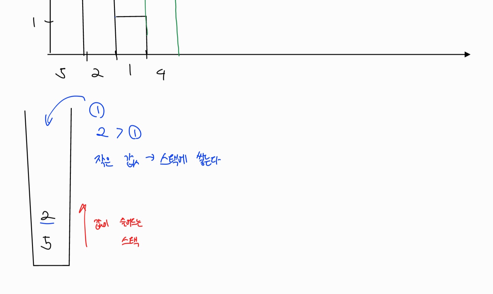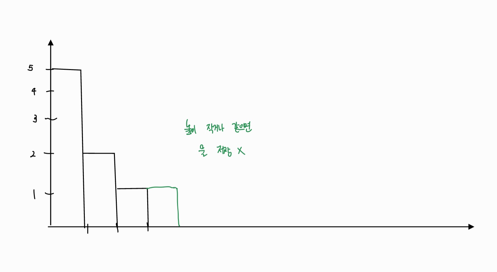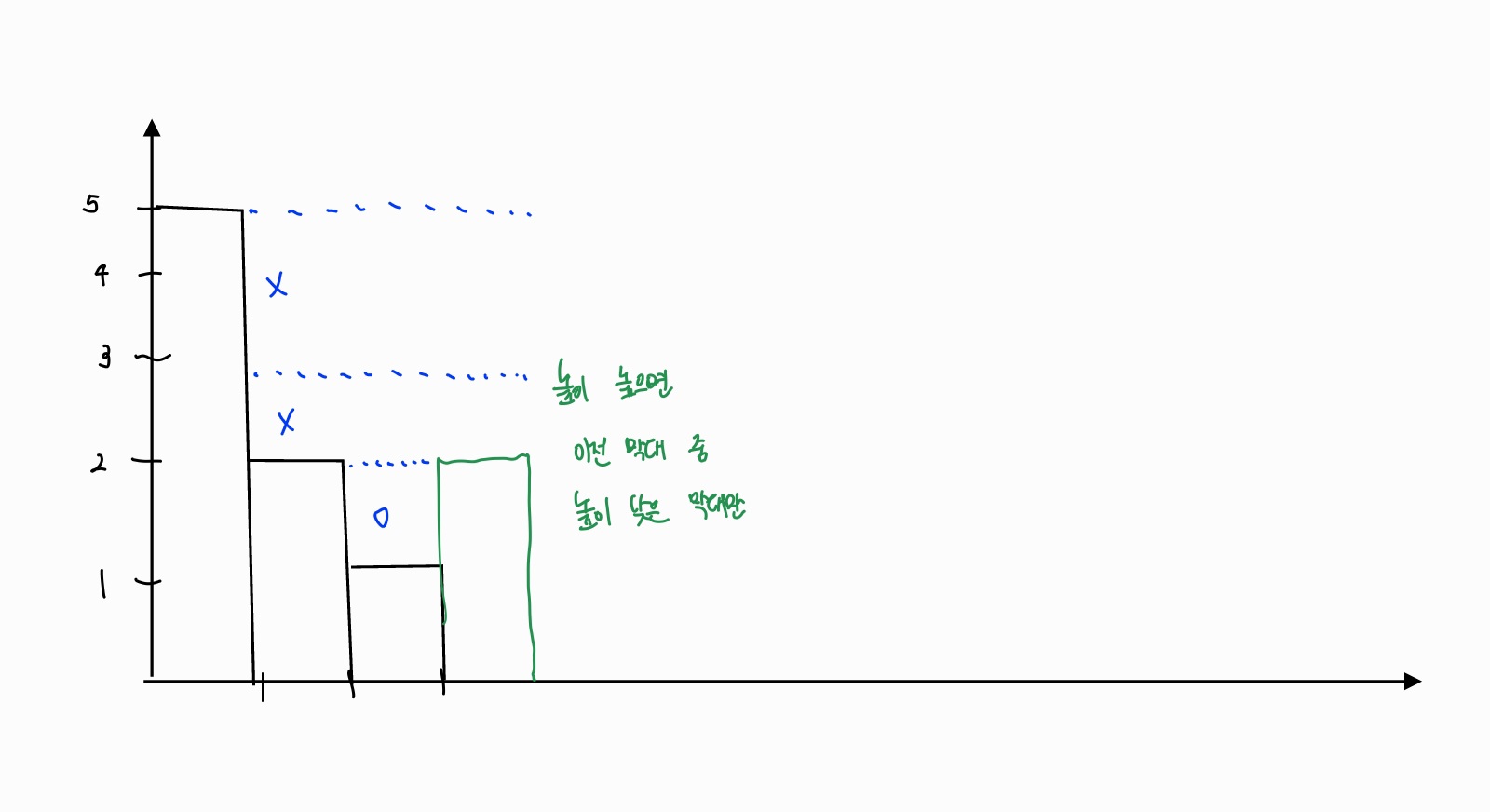 막대를 하나씩 세운다고 생각했을 때 물을 저장할 수 있는 조건을 생각해 봅시다. 다음 막대로 마지막 막대보다 높이가 같거나 작은 막대가 오면 내리막길 모양이 되어서 물을 채울 수 없습니다. (5, 4, 3, 2, 1)