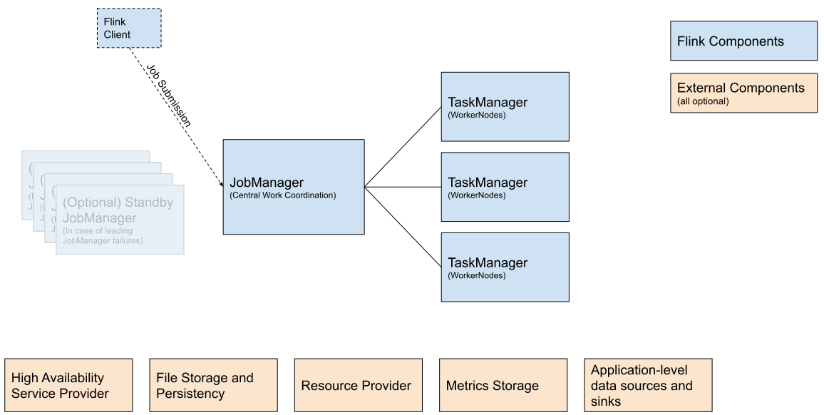 (일반적으로) 하나의 JobManager와 하나 이상의 Flink TaskManager 프로세스로 구성된 분산 시스템입니다.